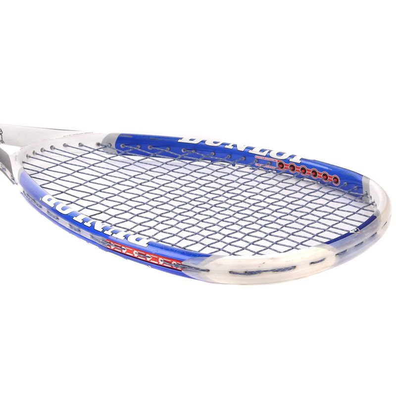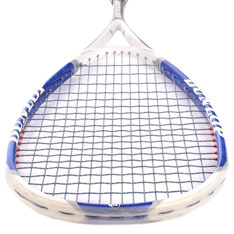 Używana rakieta Dunlop Evo Graphite w dobrym stanie, kilka małych odprysków lakieru na ramie, poobijany gromet.