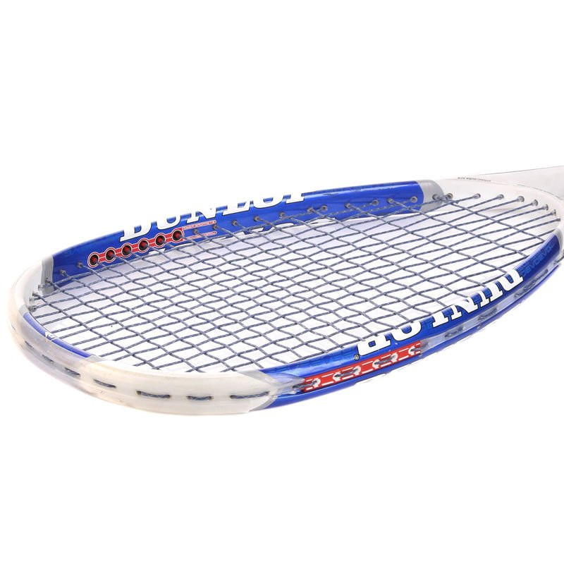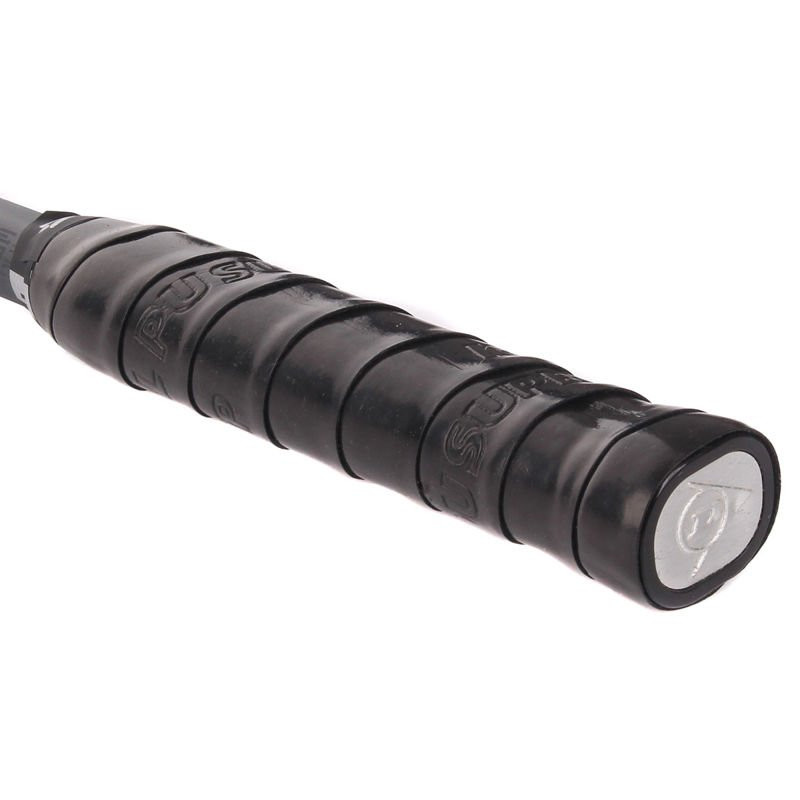 Używana rakieta Dunlop Evo Graphite w dobrym stanie, kilka małych odprysków lakieru na ramie, poobijany gromet.