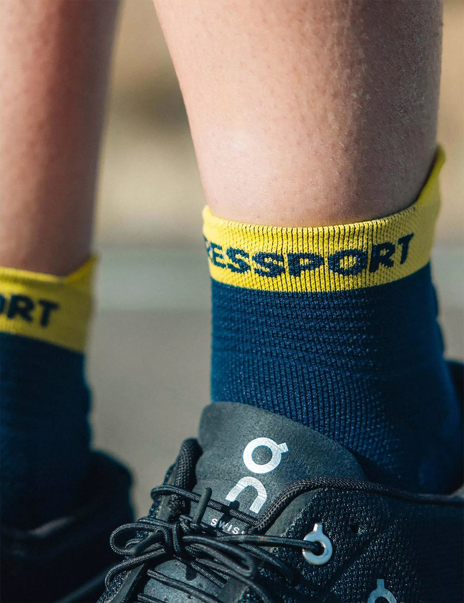 Wypróbowana i przetestowana przez zespół Compressport na setkach kilometrów - czwarta generacja skarpet Pro Racing Run Low zapewnia zrewolucjonizowane napowietrzanie i ochronę przed pęcherzami podczas biegów w ciepłe dni. Techniczny splot jest lekki i przewiewny, szybko odprowadza wilgoć, dzięki czemu stopy pozostają chłodne i suche. Przeprojektowany, szerszy nosek zapewnia bardziej ergonomiczne dopasowanie i lepszą propriocepcję, dzięki czemu palce u nóg intuicyjnie chwytają się podczas lądowania, zapewniając naturalny, płynny krok. Lekka dzianina wokół pięty, identyczna jak w wersji PRS High, zapewnia ukierunkowane wsparcie, gdy przyspieszasz, a wyściółka z tkaniny frotte na dużym palcu chroni przed poczerniałymi paznokciami podczas dłuższych biegów. Podparcie średniego łuku poprawia mikrokrążenie i zapobiega skręcaniu się i fałdowaniu materiału, zapobiegając bolesnym pęcherzom i podrażnieniom. Nowa technologia Flat.Dots łączy specjalne kropki 3D wokół ścięgna Achillesa, zapewniając dodatkową wyściółkę i ochronę, gdy stopy uderzają w asfalt. Pod stopami wzór 3D.Dots (75%) i Flat.Dots (25%) amortyzuje uderzenia i zapewnia dodatkową wentylację, przyczepność w bucie, a także delikatną stymulację, aby zwiększyć powrót żylny i opóźnić zmęczenie. Anatomiczny krój i technologie są specjalnie dostosowane do trudnych warunków biegania po drogach, a niski krój gwarantuje, że przegrzanie nigdy nie będzie stanowić problemu. Ergonomiczna zakładka z tyłu dodaje odrobinę komfortu i stylu, a jeśli kiedykolwiek zapomnisz, że wychodzisz pobiegać, dyscyplina jest dyskretnie wyhaftowana po wewnętrznej stronie.
